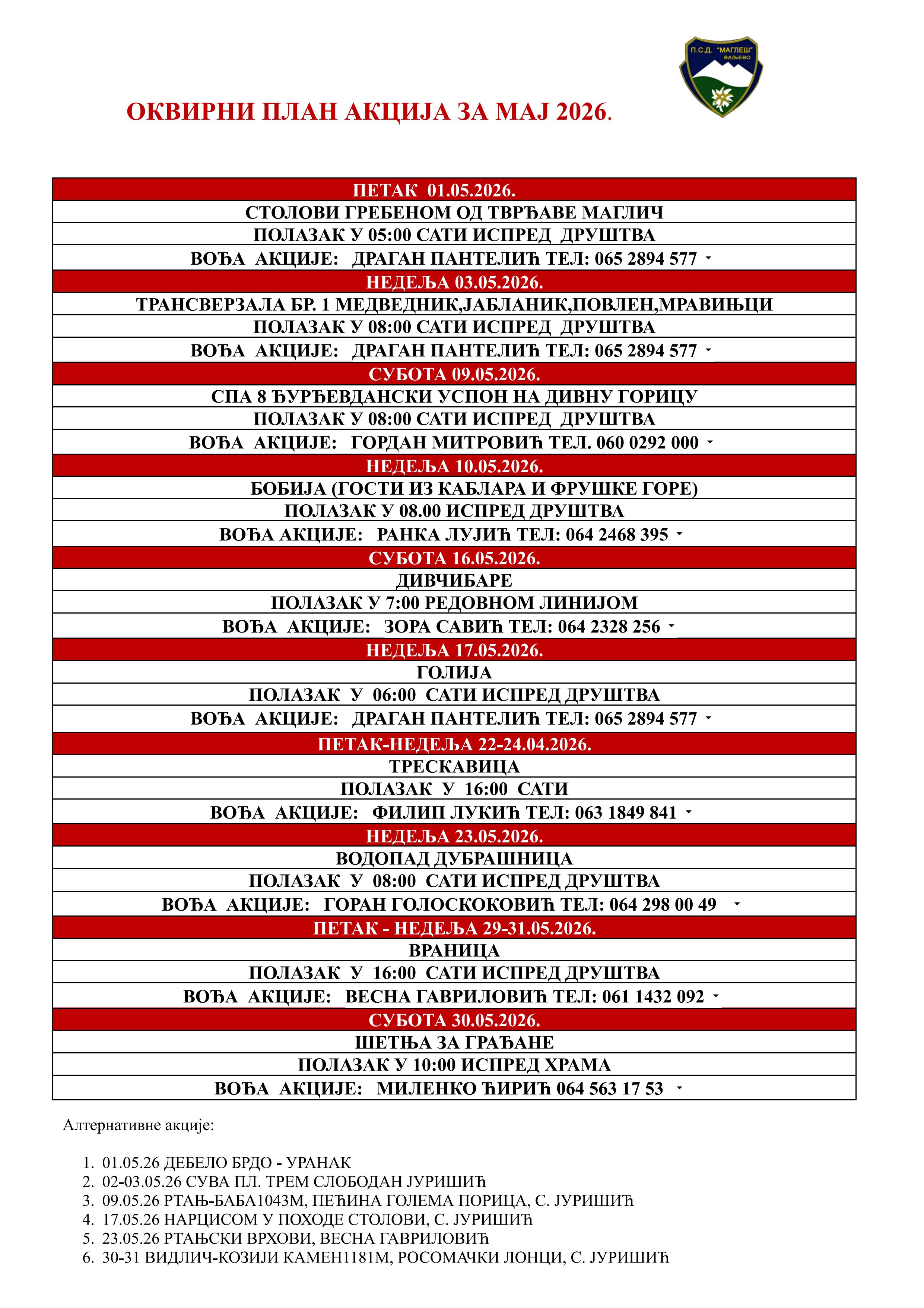 СПА „20. ВАСКРШЊИ СУСРЕТИ ПЛАНИНАРА СРБИЈЕ“ Према календару акција ПС Србије ПСД “Маглеш” Ваљево Вас позива на Савезну планинарску акцију „ 20. ВАСКРШЊИ СУСРЕТИ ПЛАНИНАРА СРБИЈЕ“ 13.04.2026. године ПРОГРАМ АКЦИЈЕ: 08:30 – 09:00 – Долазак учесника акције и пријава у планинарском дому ПСД „Маглеш“ Ваљево на Пољанама (Дивчибаре). Послужење учесника чајем и кафом, сланим и слатким пецивима,...