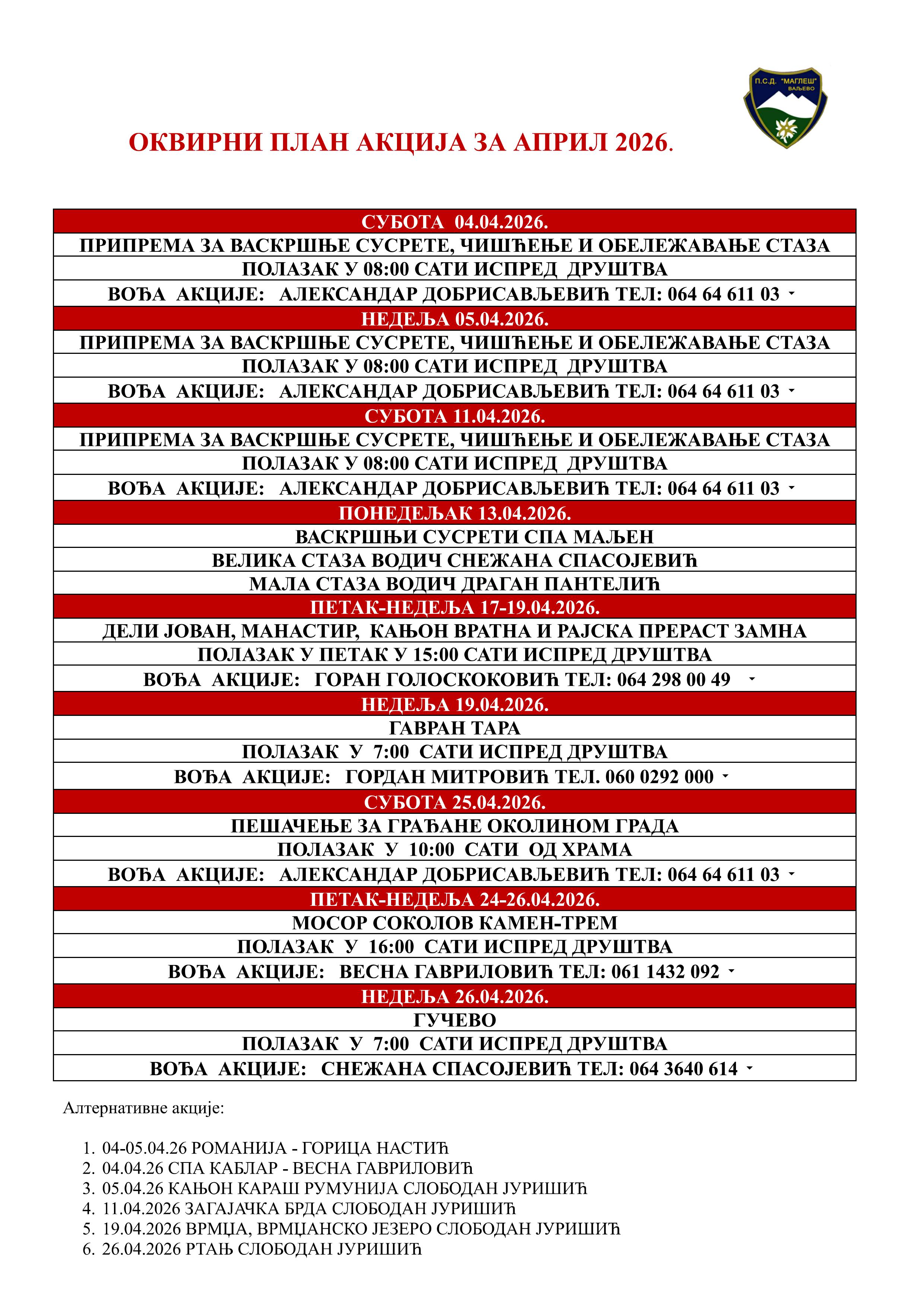 СПА „20. ВАСКРШЊИ СУСРЕТИ ПЛАНИНАРА СРБИЈЕ“ Према календару акција ПС Србије ПСД “Маглеш” Ваљево Вас позива на Савезну планинарску акцију „ 20. ВАСКРШЊИ СУСРЕТИ ПЛАНИНАРА СРБИЈЕ“ 13.04.2026. године ПРОГРАМ АКЦИЈЕ: 08:30 – 09:00 – Долазак учесника акције и пријава у планинарском дому ПСД „Маглеш“ Ваљево на Пољанама (Дивчибаре). Послужење учесника чајем и кафом, сланим и слатким пецивима,...